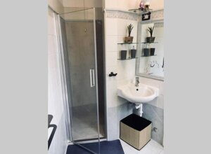 E' dotato di ampia doccia e biancheria con accessori di cortesia (sapone, gel doccia, carta igienica, asciugamani, asciugacapelli).