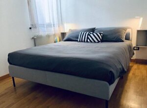 Il letto principale, è fatto di una struttura imbottita con doghe in legno e un comodo materasso DOIMO, nuovo e pulito.